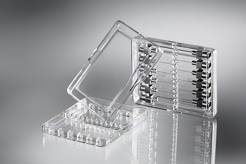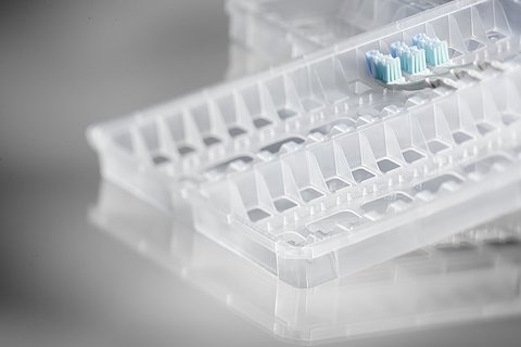Kunststoff-Tray aus Polypropylen zur Aufnahme und Transport von 32 Zahnbürstenköpfe innerhalb einer vollautomatischen Bearbeitungslinie (Mehr weg)